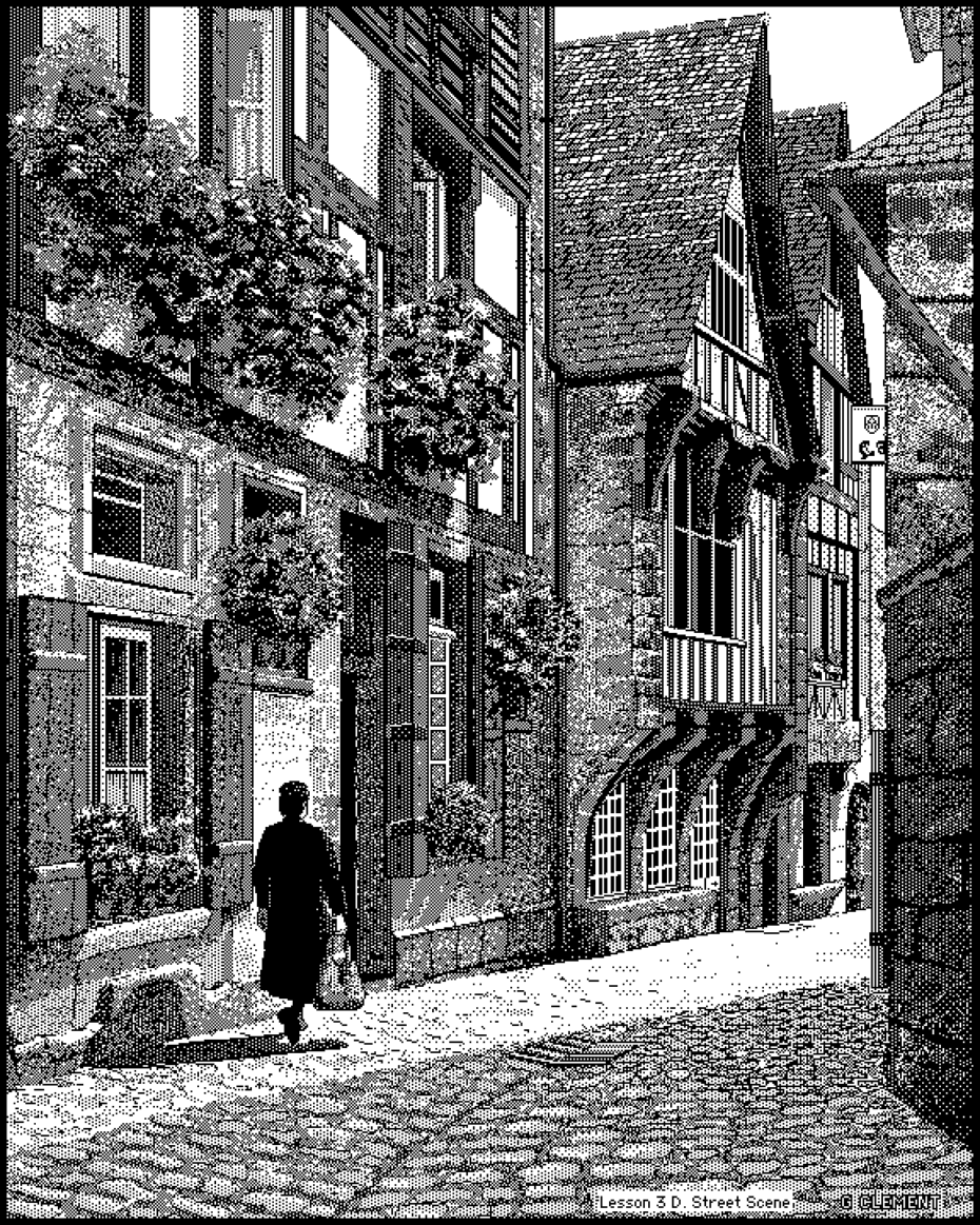 Street scene from G. Clement (1985) done in Mac Paint uncovered by Retro Tech Dreams from Twitter. Too good not to share.